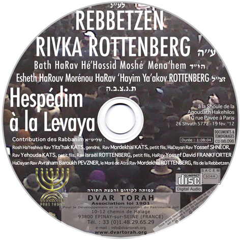88098 – 01:08:04 – REBBETZEN RIVKA ROTTENBERG aléa hashalom, Bath HaRav Hé’Hossid Moshé Mena’hem Hy »d,Esheth HaRouv Morénou HaRav ‘Hayim Ya’akov ROTTENBERG – Levaya. Avec les contributions des Rabbanim Shlita : Rosh HaYeshiva Rav Yits’hak KATS, gendre,Rav Mordekhaï KATS, petit fils, HaDayan Rav Yossef SHNÉOR, Rav Yehouda KATS, petit fils, Rav Israël ROTTENBERG, petit fils, HaRav Yossef David FRANKFORTER, HaDayan Rav Avraham Baroukh PEVZNER, le Moré de Atra Rav Mordekhaï ROTTENBERG, fils de la Rebbetzen, à la Shoule de la Agoudath Hakehilos 10 rue Pavée à Paris – 26 Shvath 5772 – 19 fév. ‘12