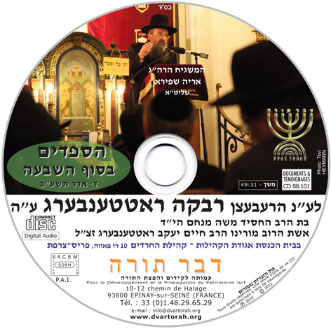 88101 – 00:48:14 – REBBETZEN RIVKA ROTTENBERG aléa hashalom, Bath HaRav Hé’Hossid Moshé Mena’hem Hy »d,Esheth HaRouv Morénou HaRav ‘Hayim Ya’akov ROTTENBERG – à la fin des Shiv ‘a. Avec la contribution unique en hébreu du HaMashguia’h Rav Arieh SCHAPIRA.