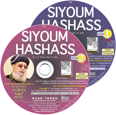 88006 – 2:10:31 – Siyoum HaChass – 5748 Grande Manifestation organisée le 6 mars ’88 au Toit Familial – Maison des Etudiants Alain de Rotschild à Paris, sur le thème de l’éducation, avec selon l’ordre des interventions : Messieurs Claude LEMMEL, F.Y NATAF, M. SAGHROUN et en hébreu Harav Hagaone Ovadia YOSSEF, puis M. Claude LEMMEL, Rav GUGENHEIM, Rav Y. AZRAN et Rav J.D. FRANKFORTER.