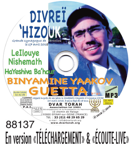 88137 – 02:43:08 – Divreï ‘Hizouk Grande synagogue de Sarcelles le 17 avril 2018 LeIllouye Nishmath HaYeshiva Ba’hour Binyamine Yaakov GUETTA zatsal, rappelé auprès de ses Pères le Shabbath Hagadol 8 Nissane 5778 – 24 mars 2018, à peine âgé de 18 ans. Ont contribué respectivement : Y. BISSOR, Israël Méïr GUETTA, Rav Shalom BERROS, Rav Ephraïm ISAAC, Rav Eliyahou ENCAOUA, David ELBAZ, Rav Mickael AMAR, Rav Shlomo KATS, Rav Yaakov GUETTA, Elisha CALVO, Y.M. SELLAM, Rav Yehiel BRAND, Rav Michel BARUCH, A. AMOUYAL, Rav Mordekhaï GUETTA, Rav Betzalel LEVY. Compilation diffusée en CD-MP3 ref. 28026.